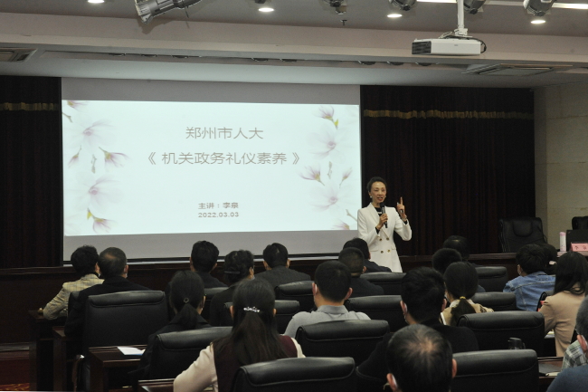 为进一步提高干部职工的文明素养、礼仪修养,提升队伍素质,3月3日下午,市人大常委会机关妇联邀请郑州市汇雅礼仪研究院院长、高级政务礼仪专家李泉女士为机关女同志们带来一场别开生面、干货满满的《机关政务礼仪素养》专题讲座,市人大常委会党组书记周富强出席本次讲座。