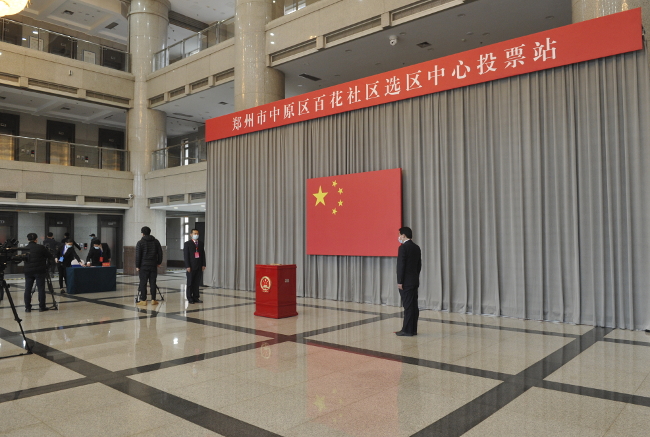 中原区百花社区选区中心投票站,五星红旗鲜艳夺目,镶嵌着金色国徽的红色票箱端放在正中位置,现场气氛庄重而热烈。