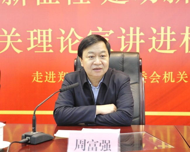 10月9日上午,由市委市直机关工委主办的“奋进新征程 建功新时代”郑州市直机关理论宣讲进机关巡回宣讲活动走进市人大常委会机关,推动习近平新时代中国特色社会主义思想深入人心,更好发挥理论宣讲统一思想、解疑释惑、凝心聚气作用,为党的二十大胜利召开营造浓厚氛围。市人大常委会主任周富强出席活动。