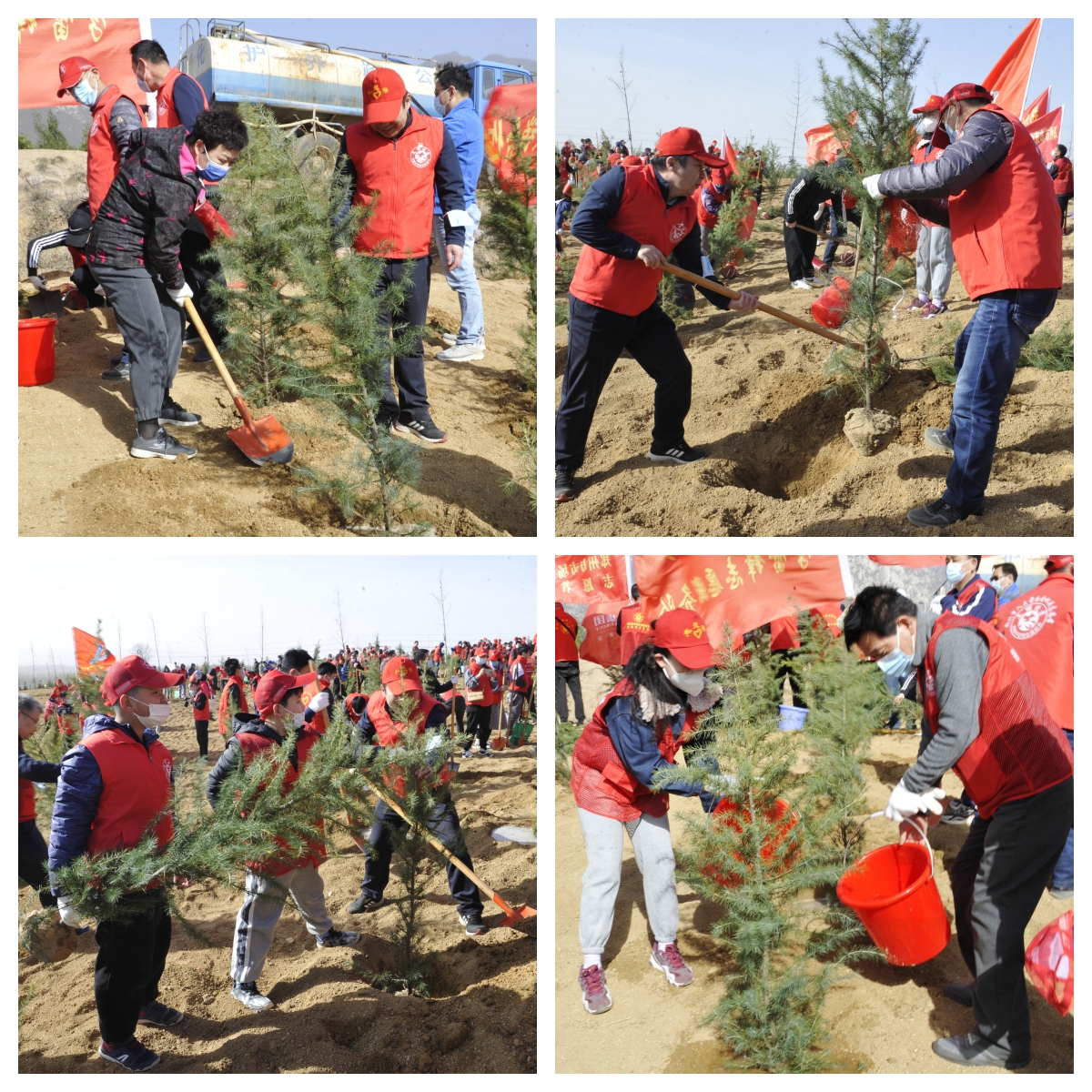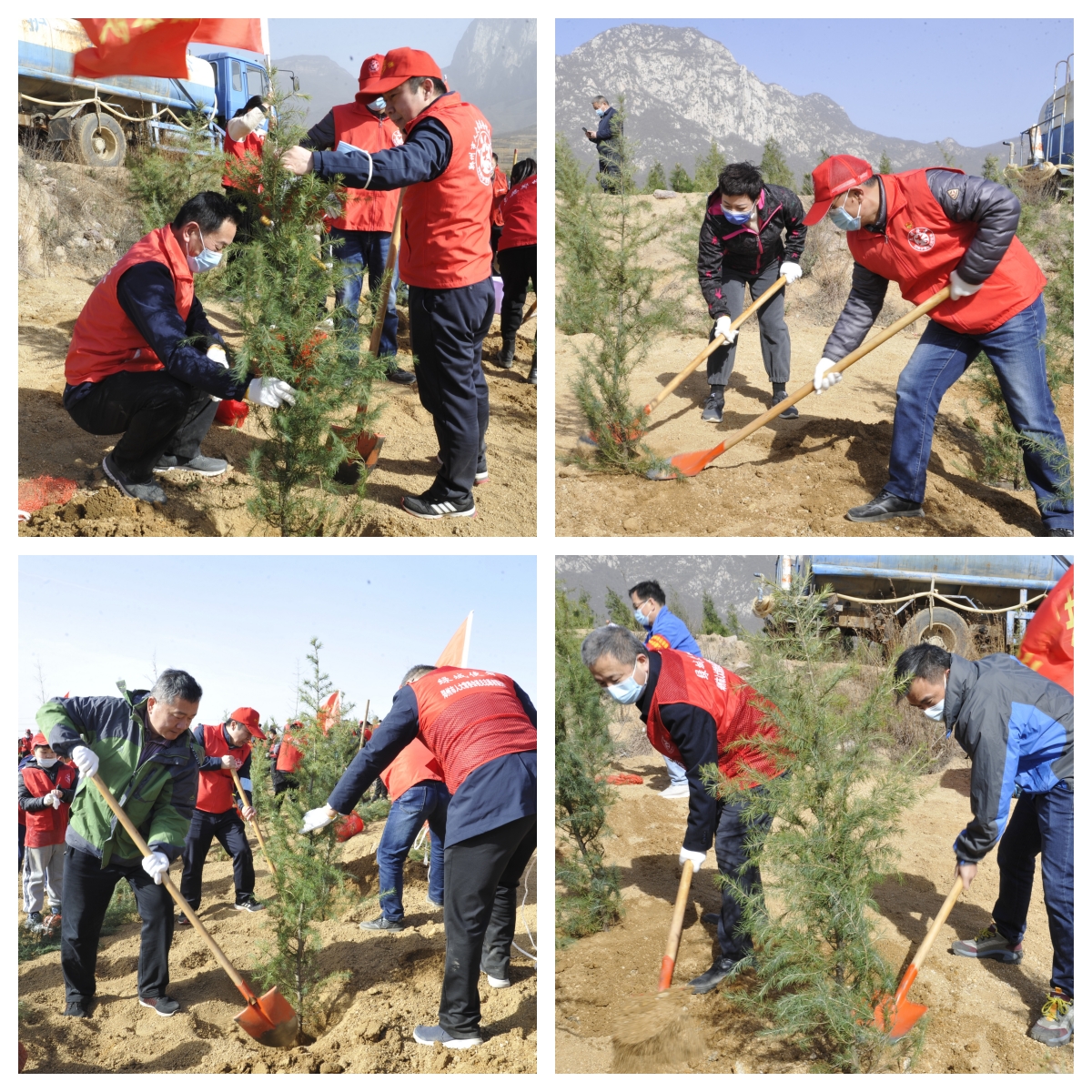 在植树现场,机关党员们认真听取技术人员的知识讲解,按照栽植规范和要求,三人一组,自由结合,在一面荒坡上挖树坑、放树苗,培士、踩实、浇水,紧密协作,栽下了一棵棵油松、侧柏。