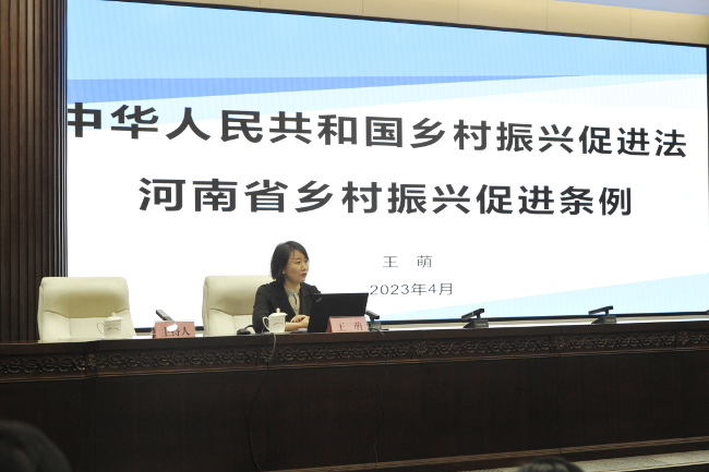 王萌从《中华人民共和国乡村振兴促进法》和《河南省乡村振兴促进条例》的立法背景、立法意义、主要内容以及贯彻执行等方面,全面深入解读了乡村振兴促进“一法一条例”的深刻内涵。同时,又结合我市具体实施乡村振兴战略的情况提出了独到见解和建议,引导与会人员更好地领会乡村振兴的法律要求和工作路径,更深入了解乡村振兴“一法一条例”在促进城乡融合共同繁荣、促进乡村治理更加有效、促进和美乡村建设提档升级等方面的作用。