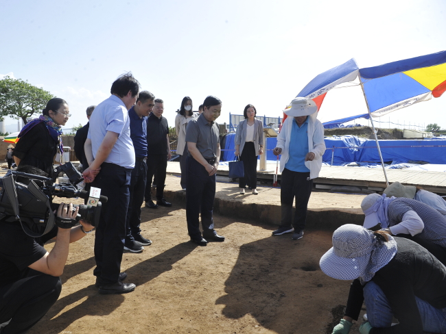 双槐树遗址是一处距今5300年前后的仰韶文化中晚期巨型聚落遗址,也是迄今为止在黄河流域发现的仰韶文化中晚期规格最高、具有都邑性质的中心聚落,被称为“早期中华文明的胚胎”。周富强走到遗址发掘现场,与考古工作人员深入交谈,详细了解遗址发掘过程、最新发掘成果及重要价值等,实地察看遗址考古发掘情况,并听取双槐树遗址保护立法工作的意见和建议。