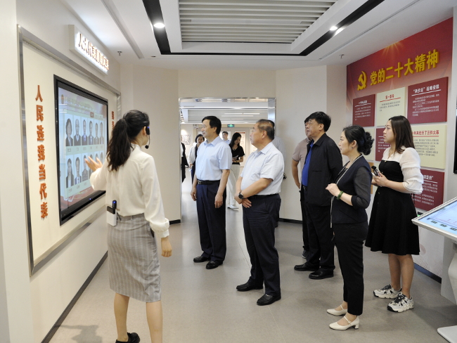 考察组一行观看展陈图片、实物以及多媒体互动平台等,详细询问基地建设、运行管理、活动开展、作用发挥等情况,全方位了解宪法和人民代表大会制度的发展历程以及人民代表大会制度在郑州的生动实践。