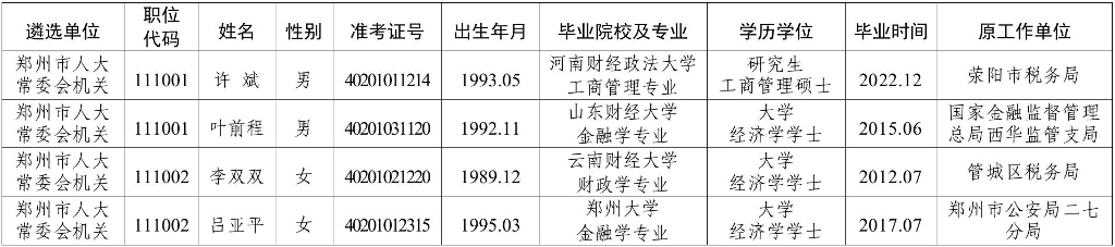 根据中共郑州市委组织部《关于做好2024年遴选公务员考察工作的通知》规定,经过笔试、面试、考察、体检等环节,经郑州市人大常委会机关党组会议研究,确定以下4名同志为郑州市人大常委会机关2024年公开遴选公务员拟选用人员(名单附后),现予以公示。