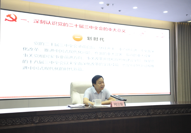 周富强指出,学习好宣传好贯彻好党的二十届三中全会精神,是当前和今后一个时期的一项重大政治任务。全会重点研究进一步全面深化改革、推进中国式现代化问题,作出的重大部署、取得的重大成果,事关党和国家事业前进方向,事关改革开放和现代化建设全局,既是党的十八届三中全会以来全面深化改革的实践续篇,也是新时代新征程推进中国式现代化的时代新篇。要站在战略和全局的高度认识和把握全会部署的改革举措,在全面深化改革上做文章、在深化改革上下工夫,确保改革推进蹄疾步稳、改革举措落地见效。