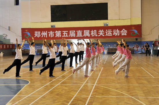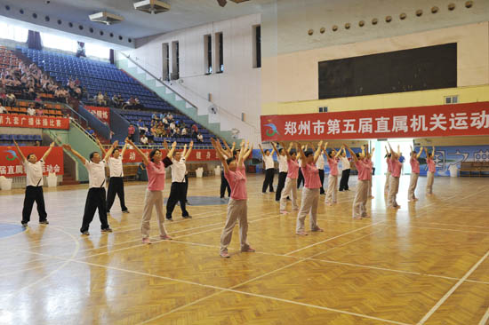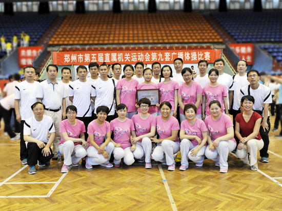 6月20日—21日,郑州市属机关第五届运动会广播体操预赛、决赛在市体育馆举行。经过两天的比赛,代表着市人大常委会办公厅的体操队以飒爽的英姿、整齐划一的出色表演,获得了场上各代表队和观众的阵阵掌声和喝彩,充分展示了市人大常委会机关激情洋溢、和谐文明、蓬勃向上的形象。参加比赛的广播体操队员们,在姜朝红副秘书长的带领下,克服重重困难,利用各种时间,出力流汗,艰苦训练。训练中,有的伤着腰了,有的扭住脚了,仍然咬紧牙关坚持训练。经过一个多月一丝不苟的艰苦训练,在比赛中赢得在场所有观众的热烈掌声,最终赢得了广播体操比赛一等奖。