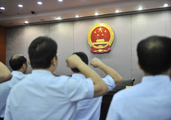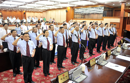 新任命的市中级人民法院工作人员参加就职宣誓仪式