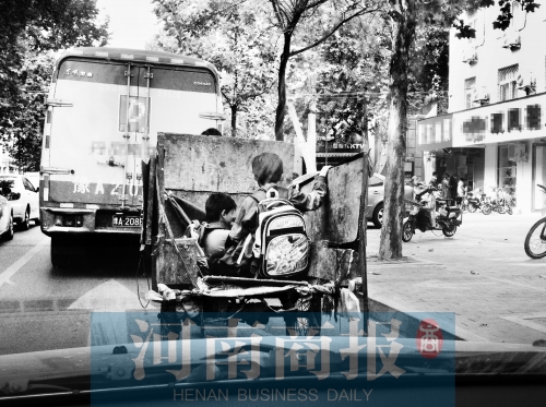 昨天中午的郑州街头,两名小学生放学后乘垃圾清运车回家