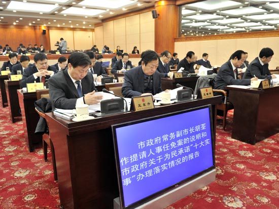 会议听取了市政府常务副市长胡荃作的提请人事任免案的说明和市政府关于为民承诺“十大实事”办理落实情况的报告。2012年我市“十大实事”共投入资金57.72亿元,涵盖就业保障、社会救助、文化教育、医疗卫生、道路交通等10个方面60项任务,由29个责任单位和各县市区负责落实。目前已按照计划完成目标任务58项,其中有22项超额完成任务,2项因客观原因无法组织实施。