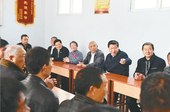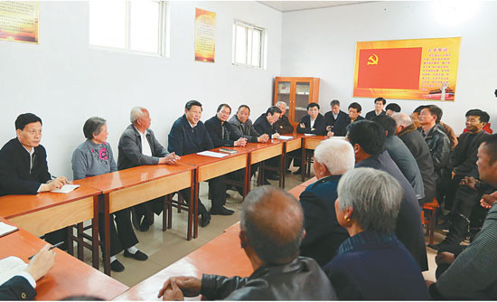 3月17日,习近平在东坝头乡张庄村村委会与干部群众座谈,听取意见和建议。 新华社发