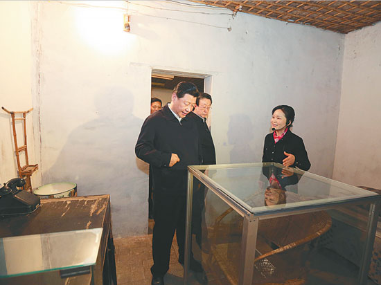 兰考县东坝头乡张庄村,是焦裕禄当年找到防治风沙良策并首先取得成功的地方。下午4点10分许,习近平来到这里考察。他牵着85岁的张景枝老人的手来到她家,看厨房,察卧室,同一家人促膝交谈,问家里一年产多少粮食?种的蔬菜够不够吃?农业补贴和低保、医保等政策是否享受到?对新农村建设有哪些要求?习近平叮嘱当地干部要切实关心农村每个家庭特别是贫困家庭,通过因地制宜发展产业促进农民增收致富。