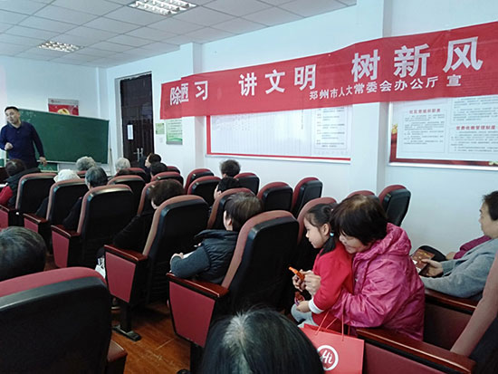 根据市文明办《关于开展“移风易俗树新风 文明扶志助脱贫”系列活动的通知》要求,为进一步教育引导广大市民倡树文明新风,除陈旧陋习,3月21日下午,郑州市人大常委会机关邀请郑州市中医院康复科主任梁行到百花社区为居民开展健康保健知识讲座和义诊,普及健康知识,传播健康理念,40余位居民参加了此次讲座。