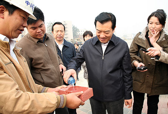 在京沙快速通道中原路口施工工地,市人大常委会主任白红战现场检验铺设人行道砖的透水效果