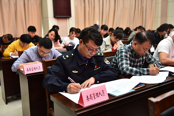 动员会结束后,中原区人大常委会水污染防治“一法一条例”执法检查组召开培训测评会议,对参会的90余名“一府两院”部门负责人、一线执法和管理人员、涉水企业负责人等进行了水污染防治“一法一条例”法律知识测试,区人大常委会副主任余泽军、党组副书记吴明勇进行监考和巡视。