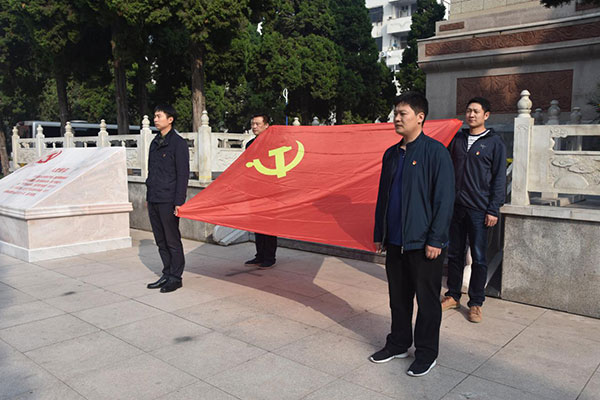 在革命烈士纪念碑前,中牟县人大机关全体党员干部高举右拳,面对党旗,重温了入党誓词,表达了不忘初心,永远跟党走的坚定决心和战胜一切困难的坚定信念。